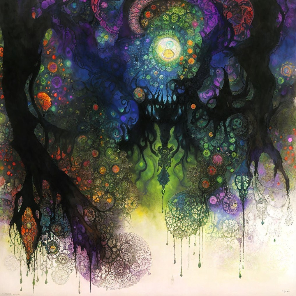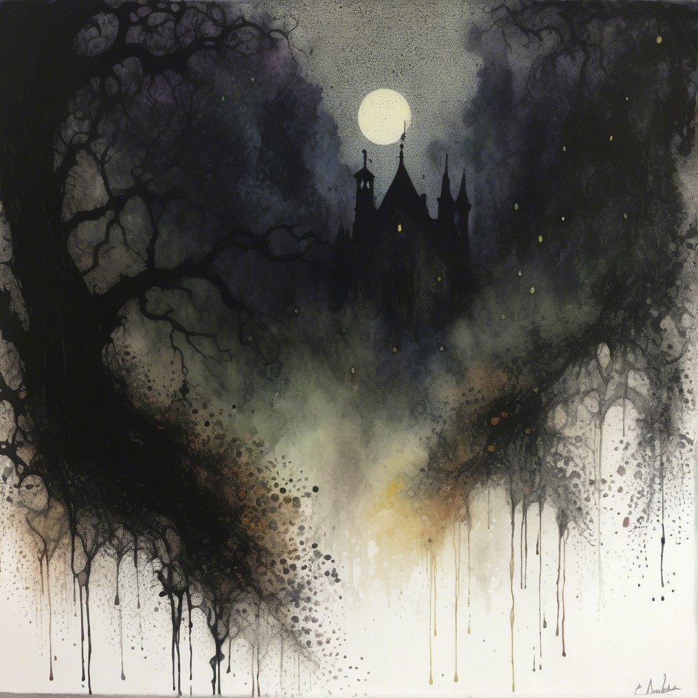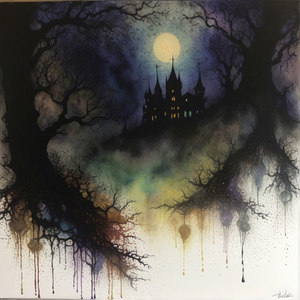 A whimsical, colorful night scene features a silhouette of a castle against a vibrant, starry sky. Dark trees frame the edges, while a full moon casts a mystical glow over the landscape.
