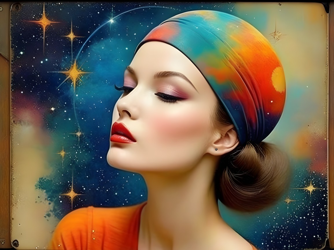 A cosmic portrait of a woman with a vibrant turban, set against a swirling galaxy backdrop filled with stars and planets, radiating a sense of celestial beauty and mystery.