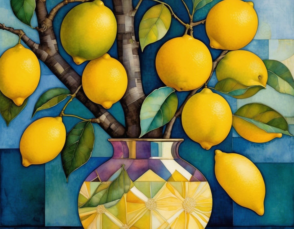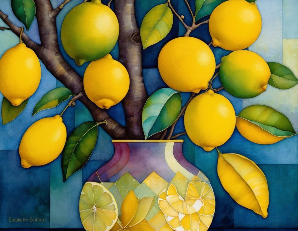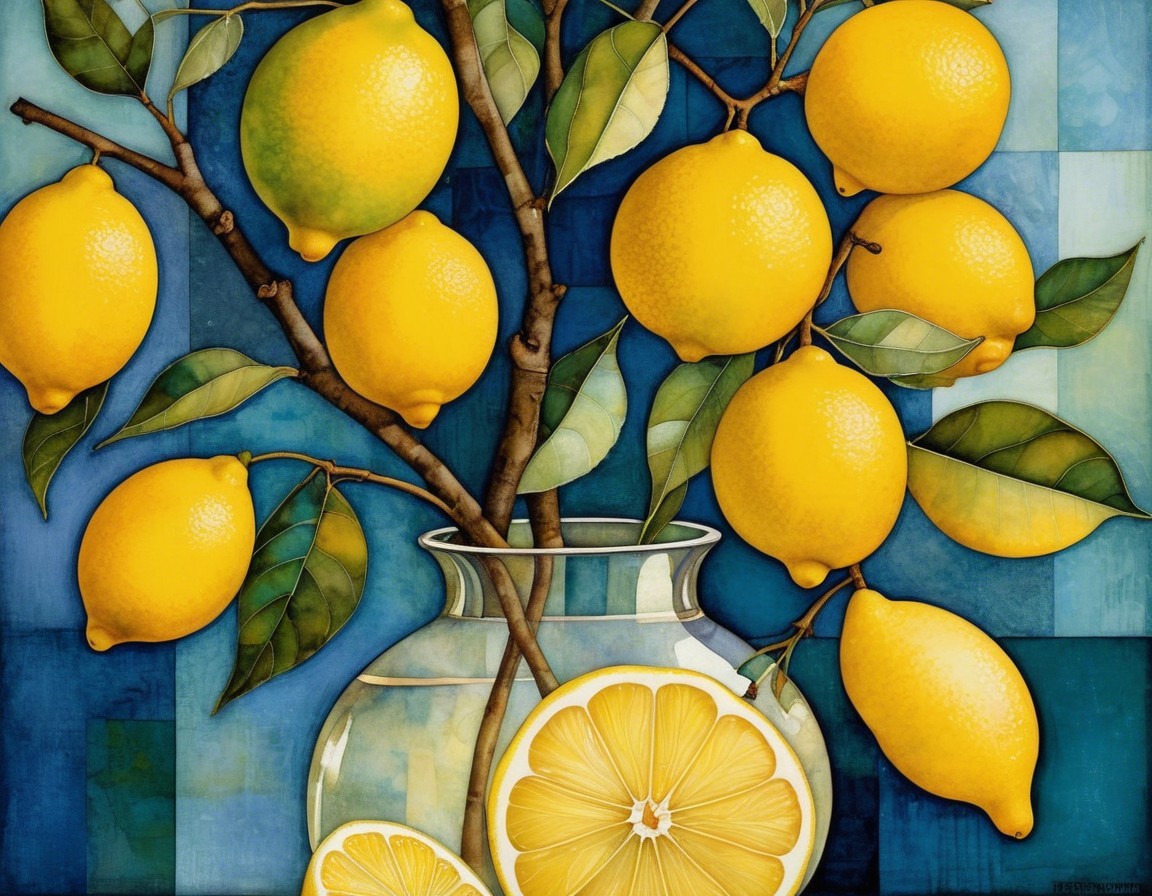 This vibrant artwork features a branch laden with bright yellow lemons, accompanied by a glass jar holding sliced lemon. The background showcases blue and green hues, enhancing the fresh theme.