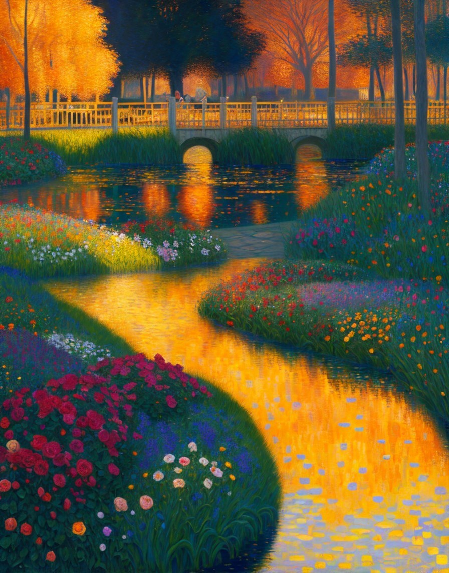 Prompt: 3D Acrylic, sunset by William Turner, a beautiful garden with numerous flowers night-blooming with vibrant saturated colors, golden sunset rays shimmering over the scene, intricate, satiny, high quality, shimmering elegant style, highly detailed, glistening magic style with elements in the style of Jan Toorop, and elements in the very best style of Gustav Klimt