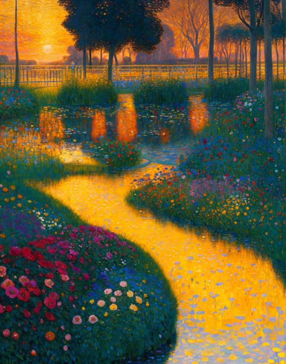 Prompt: "3D Acrylic painting in the very best style of Gustav Klimt of a beautiful garden with numerous flowers with vibrant spectacular colors, golden sunset rays shimmering over the scene, detailed intricate, satiny, high quality, shimmering elegant style, highly detailed, glistening magic style with elements in the style of Jan Toorop"