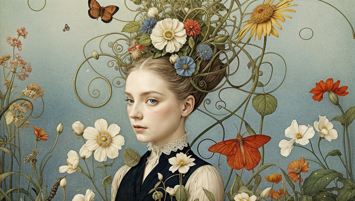 A serene woman adorned with a floral headdress stands amidst colorful flowers and butterflies, embodying a whimsical and ethereal beauty in a soft, dreamy setting.