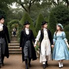 In a lush garden, a young man in a formal suit walks hand-in-hand with two elegantly dressed women in vintage gowns, exuding a charming Victorian aesthetic amid blooming flowers.