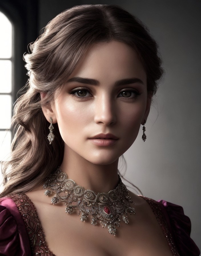A young woman with long, flowing hair and a serene expression. She wears elegant jewelry, including a detailed necklace and earrings, complementing her sophisticated outfit and soft lighting.