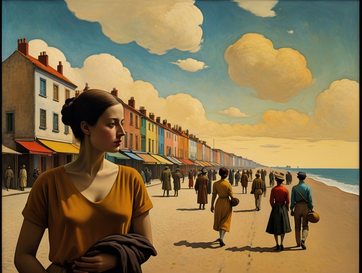 A serene beach scene features a woman in a yellow blouse gazing thoughtfully. Colorful houses line the coast under a dramatic sky filled with clouds and a warm sun. Rocks dot the sandy shore.