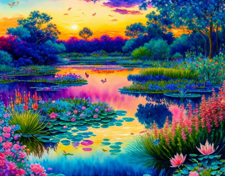Prompt: "Wide view, 3D watercolor patchwork, in the very best style of Monet of a pond reflecting a beautiful Tingatinga style garden with numerous flowers with vibrant spectacular colors, luxurious trees and plants with delicate leaves in shades of azure blue and teal and gold, golden sunrise rays shimmering over the scene, detailed intricate, satiny, high quality, elegant, highly detailed, glistening magic style with elements in the style of Gustav Klimt"