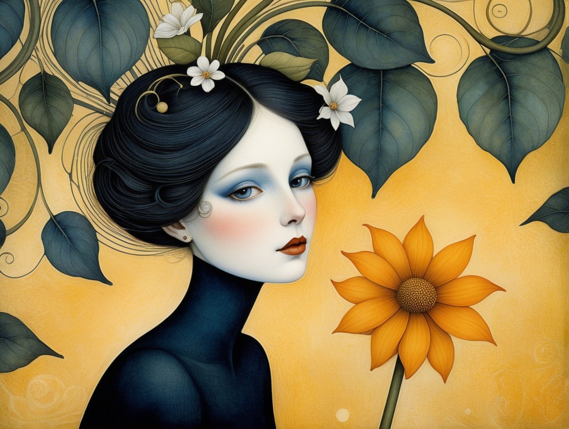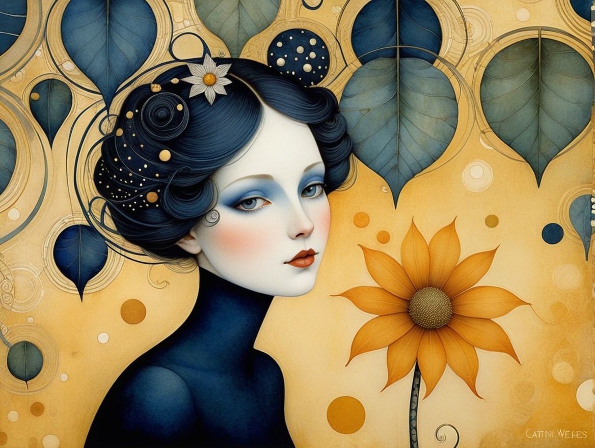 A captivating portrait of a woman with dark, curly hair and striking blue makeup. She gazes thoughtfully against a vibrant background of golden and blue circles, creating an abstract, artistic vibe.