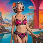 A striking figure with fiery red hair poses in a metallic bronze outfit against a vivid, otherworldly landscape featuring planets and alien terrain, creating a bold and futuristic vibe.