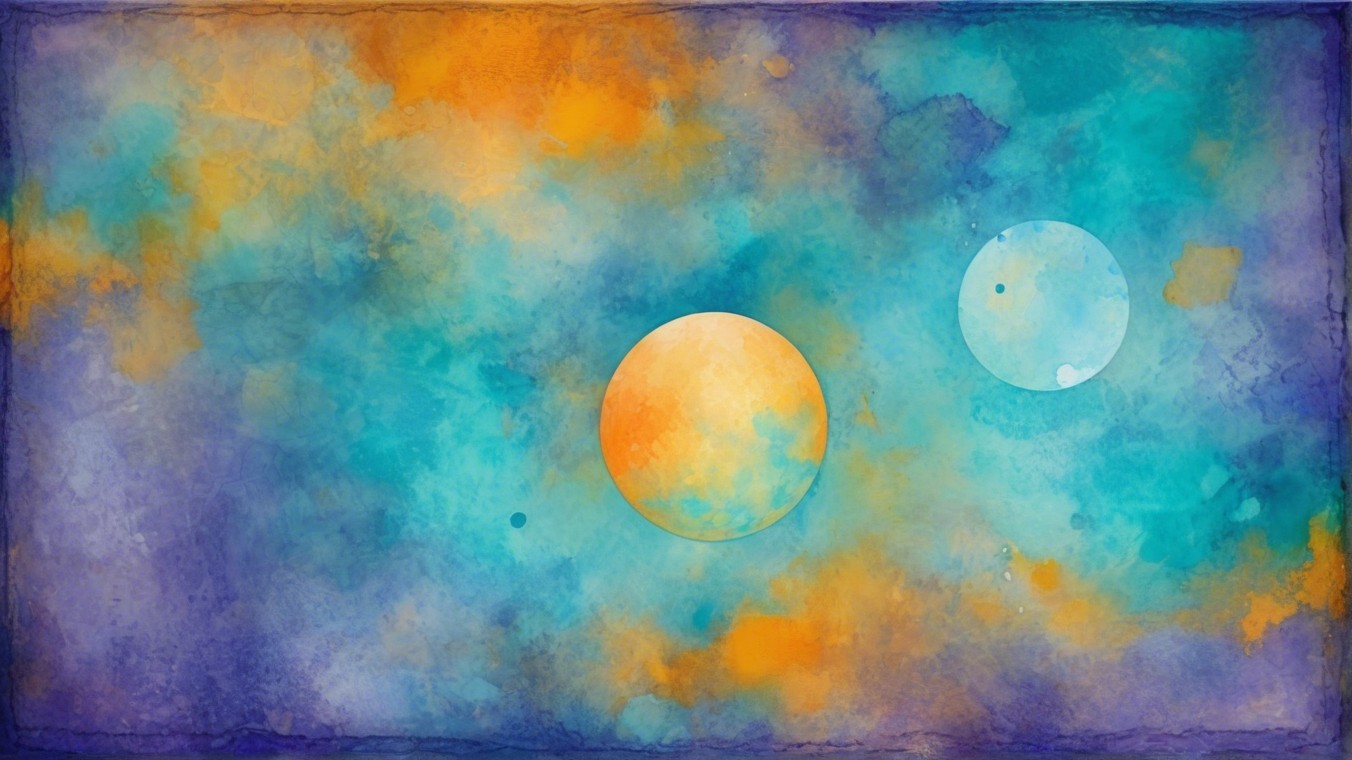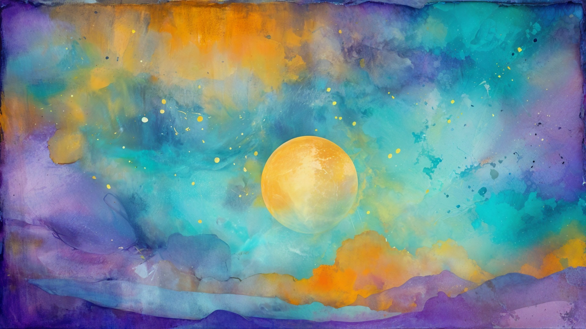 The image features vibrant watercolor shapes in shades of orange, teal, and purple, centered around a glowing circle. The abstract design creates a sense of depth and harmony.