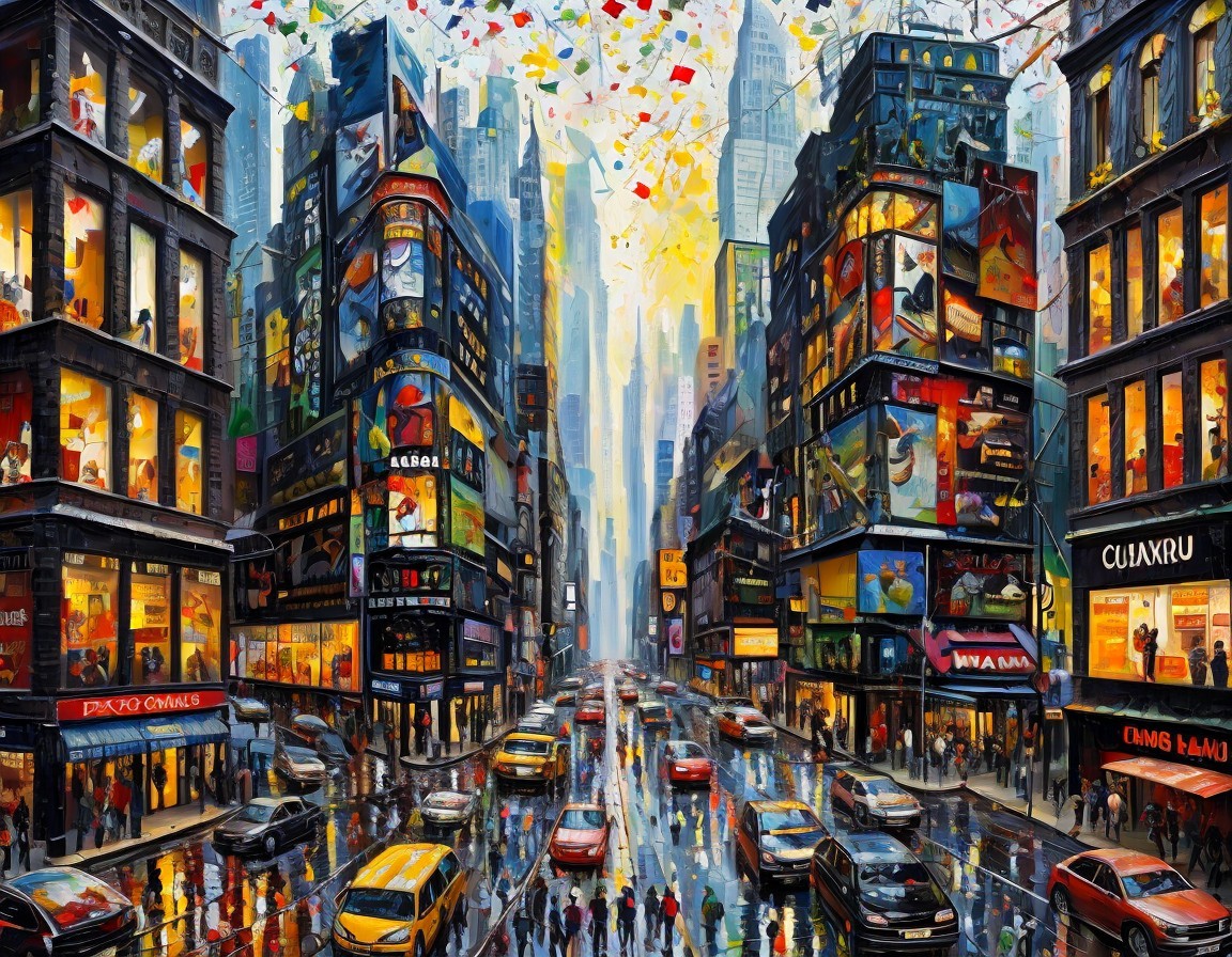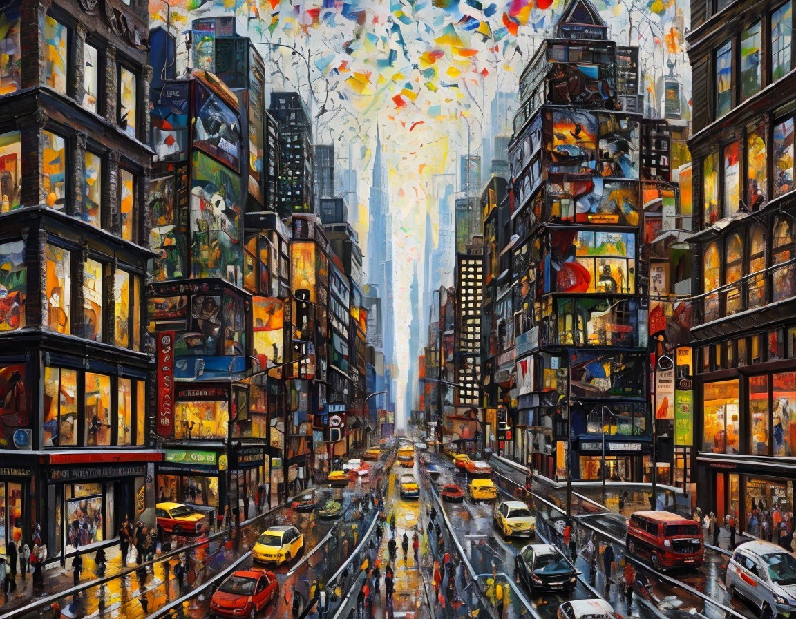 A vibrant, bustling city street scene with cars, colorful buildings, and confetti under a twilight sky.
