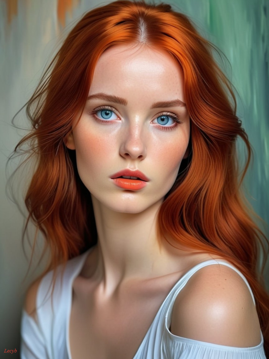 A young woman with striking bright red hair and blue eyes gazes softly at the viewer. Her fair skin is complemented by natural makeup, featuring a hint of peachy blush and lip color.