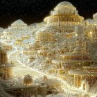 A majestic, golden cityscape rises amidst a desert, featuring ornate domes, intricate architecture, and illuminated pathways, all bathed in the warm glow of a sunset.