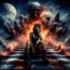 A fantasy scene features a warrior woman seated on steps, surrounded by eerie flames and a colossal skull monster. Dark ruins and mythical figures loom in the moonlit background.
