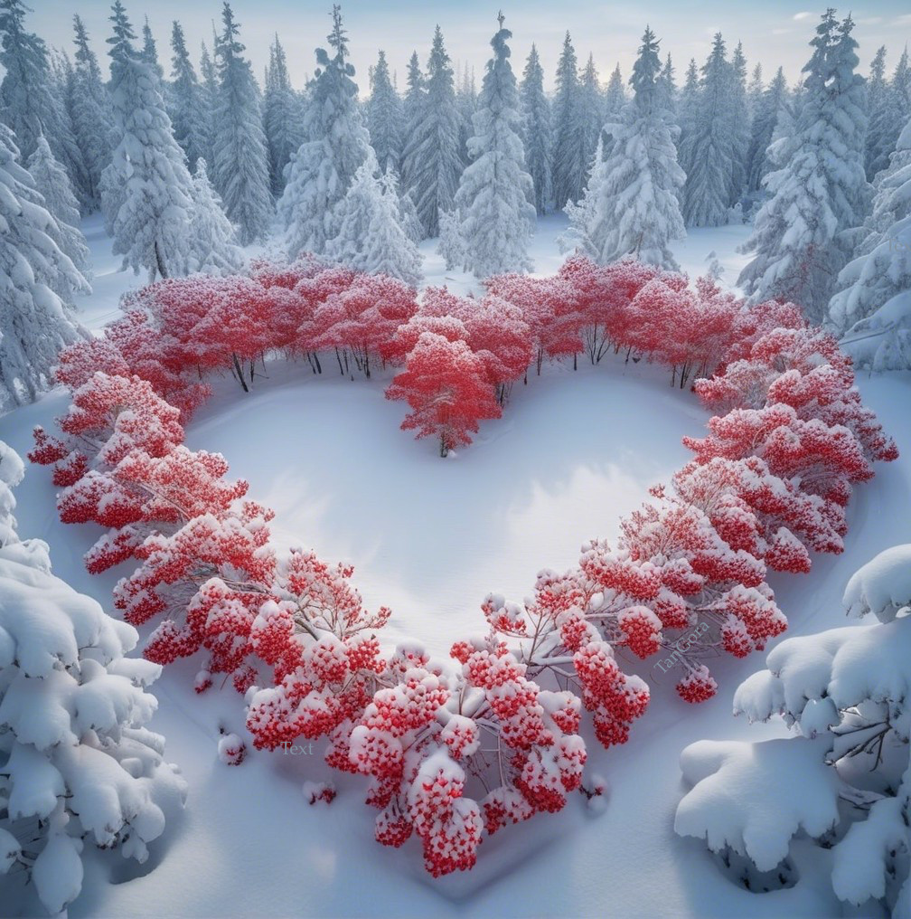 A serene winter landscape features a heart-shaped arrangement of red foliage amidst a snowy forest, with tall evergreen trees standing softly in the background, creating a romantic and peaceful scene.