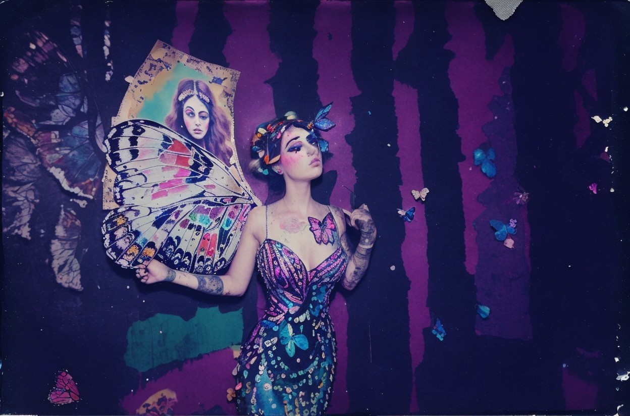 A person with butterfly wings and sequined dress poses artistically against a colorful, abstract backdrop with butterflies.