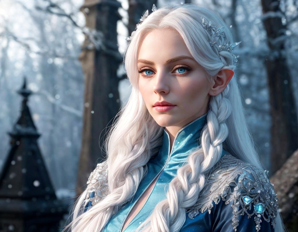 A fantasy character with long, silver hair and striking blue eyes, wearing an intricate ice-blue gown adorned with snowflake patterns. There are frosty trees and a mystical atmosphere in the background.