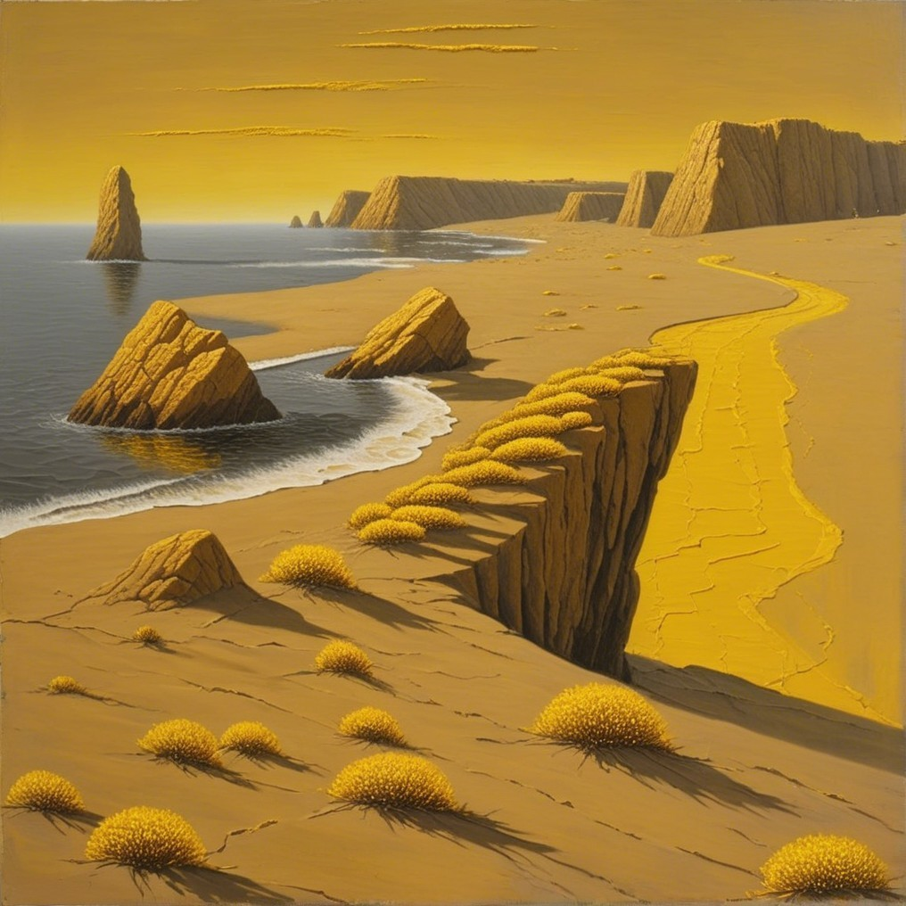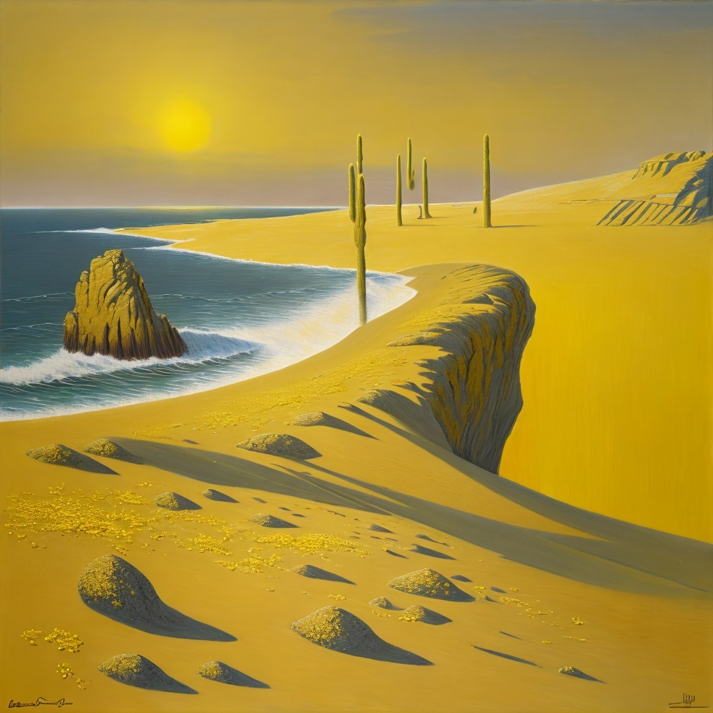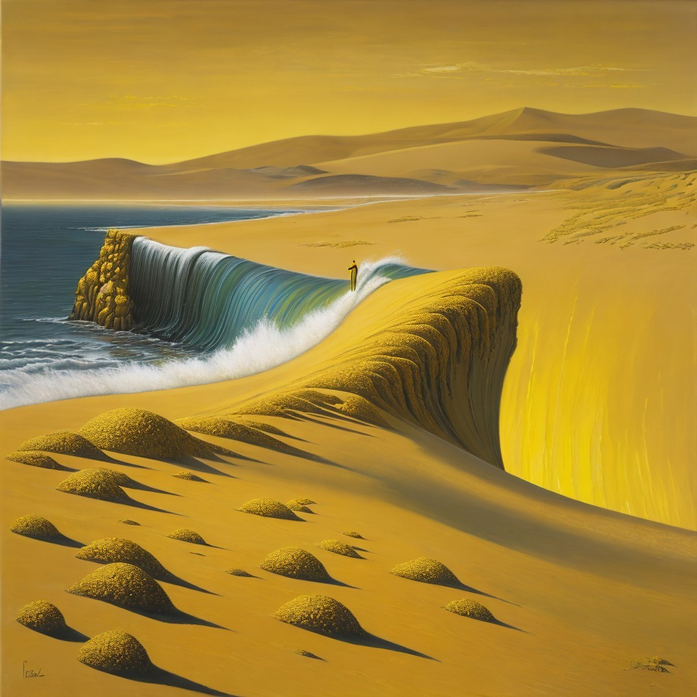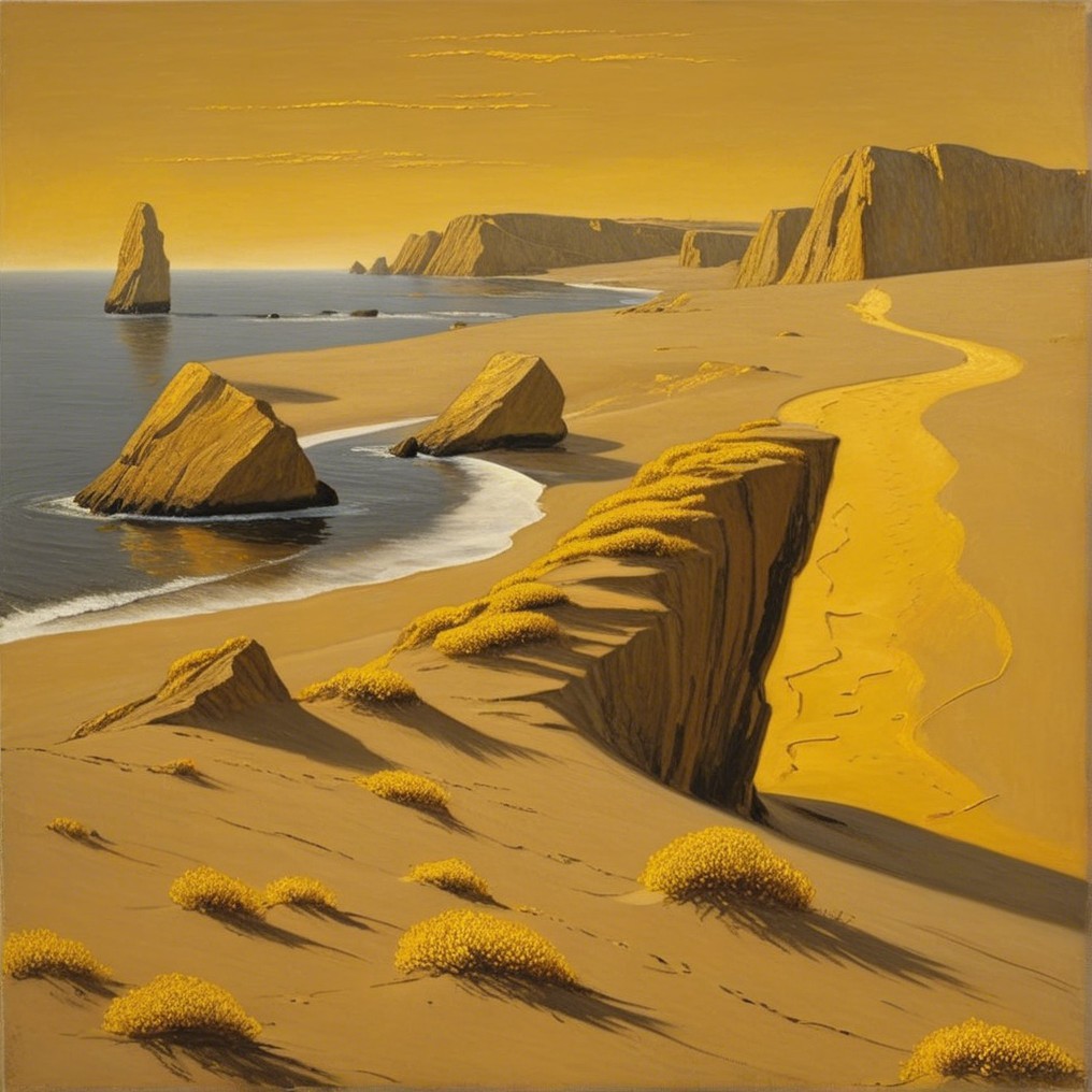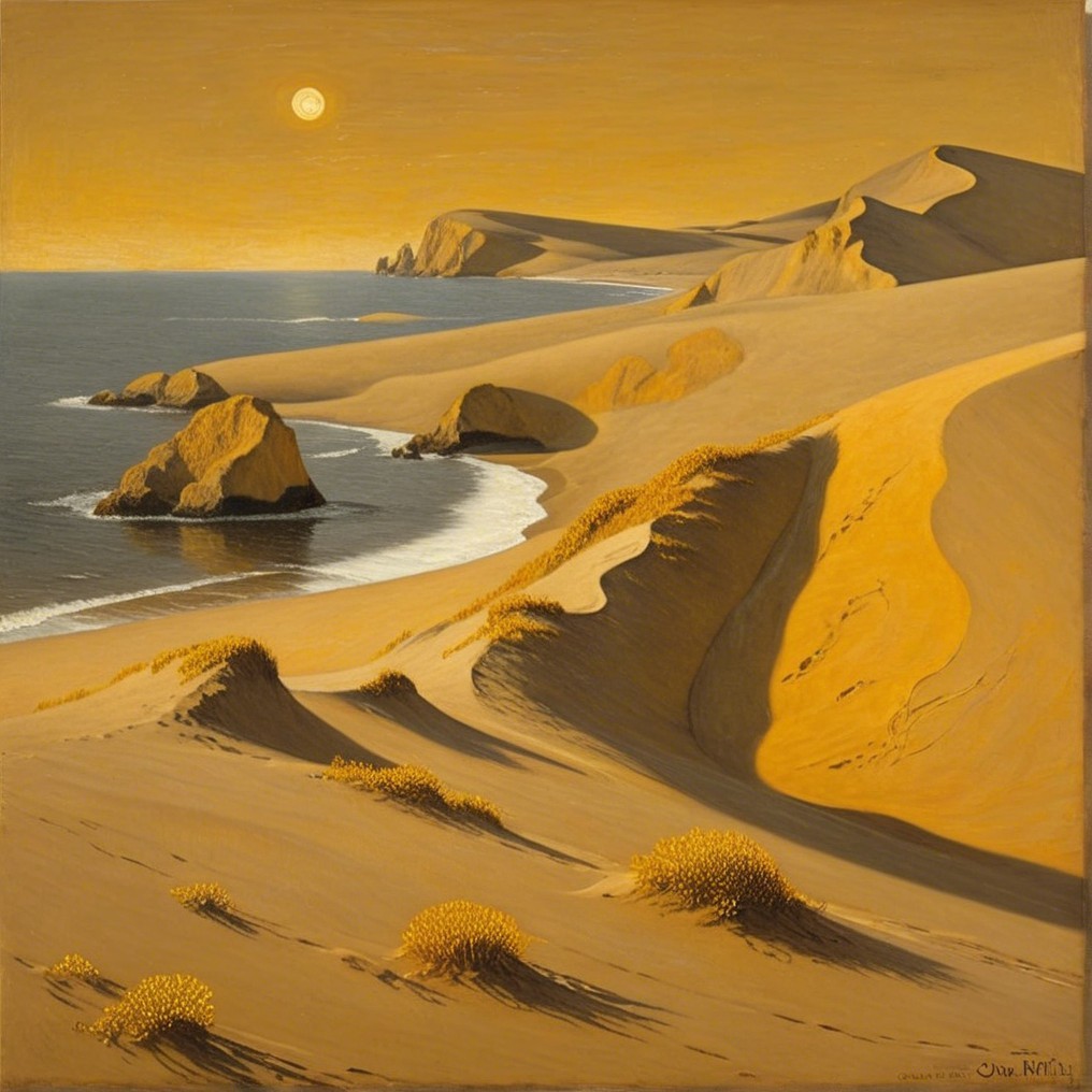 Artistic Statement: "Footprints in the Golden Dunes" captures the ephemeral beauty of solitude, blending surrealism with subtle symbolism. Influences from Yves Tanguy and Caspar David Friedrich are evident in the poetic interplay of light, texture, and shadow. The footprints evoke themes of journey, memory, and impermanence.