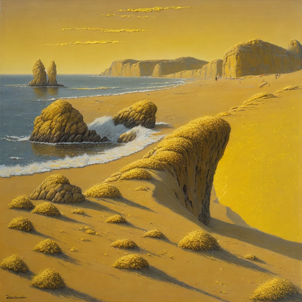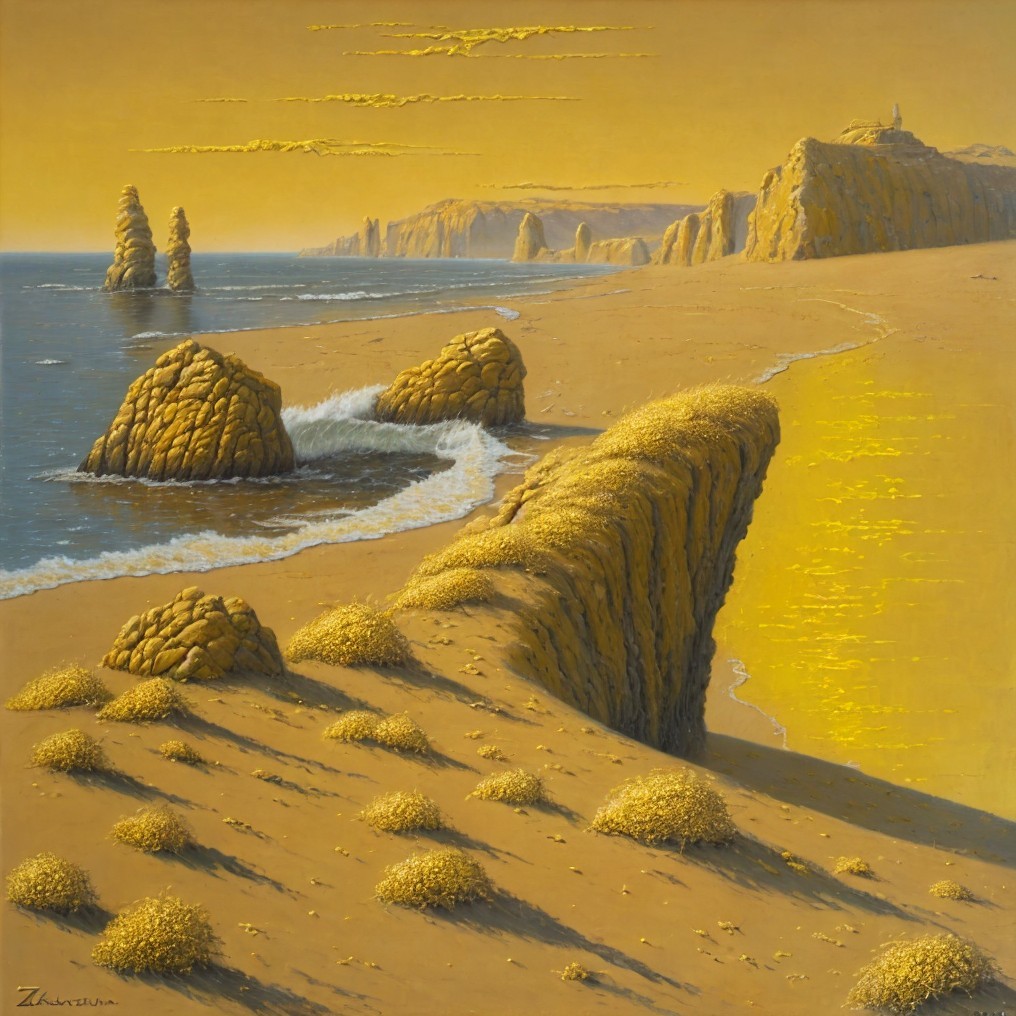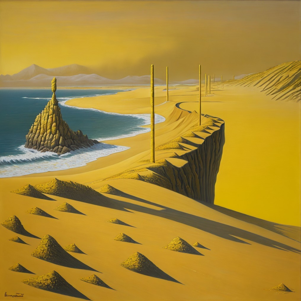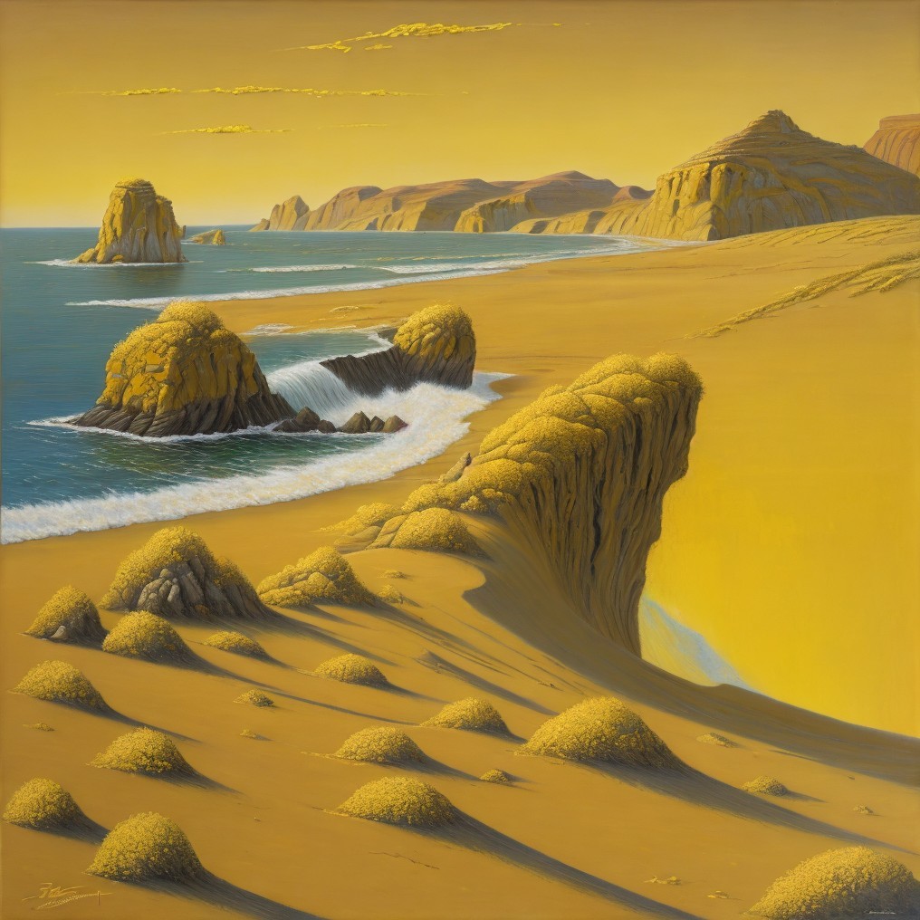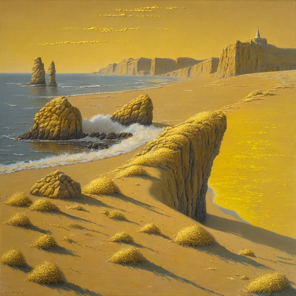Artistic Statement: "Footprints in the Golden Dunes" captures the ephemeral beauty of solitude, blending surrealism with subtle symbolism. Influences from Yves Tanguy and Caspar David Friedrich are evident in the poetic interplay of light, texture, and shadow. The footprints evoke themes of journey, memory, and impermanence.