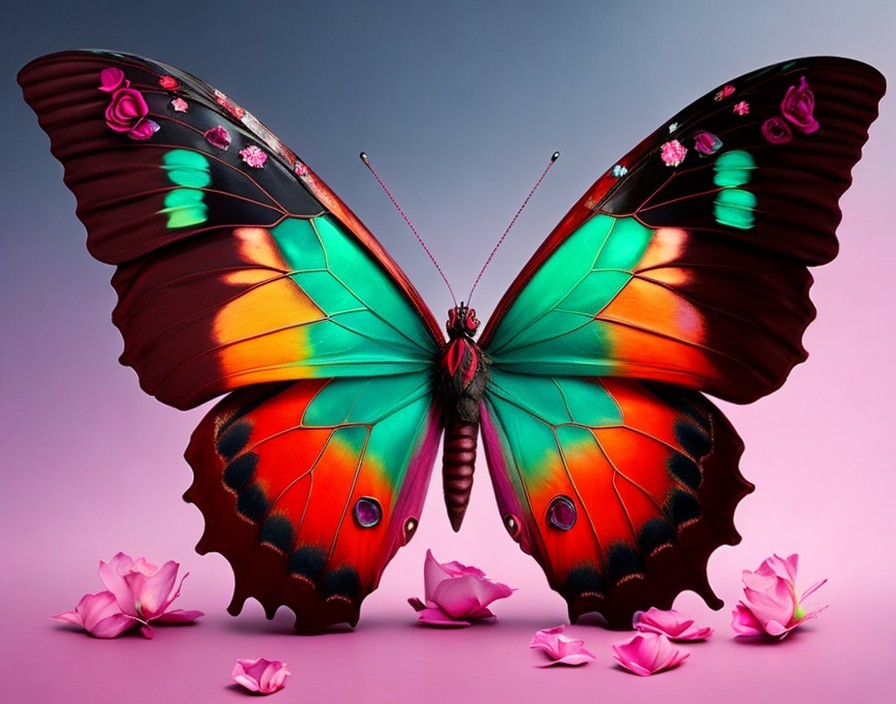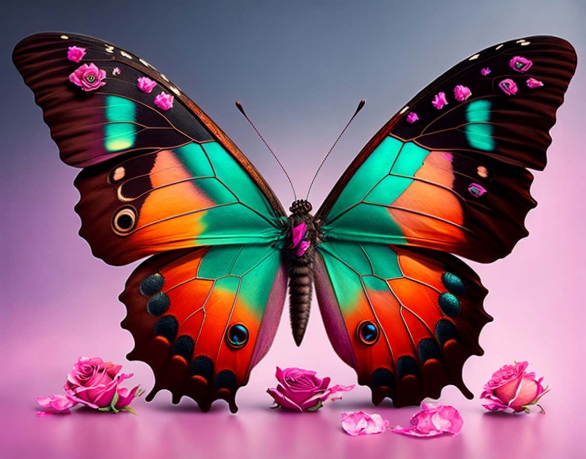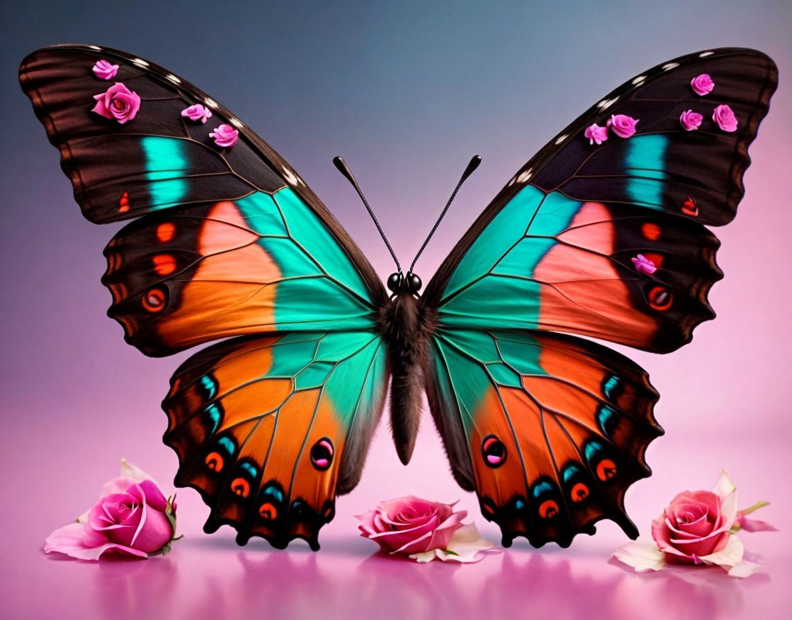 A vividly colored butterfly with intricate wing patterns hovers above roses against a pastel sky; smaller butterflies flutter in the distance.