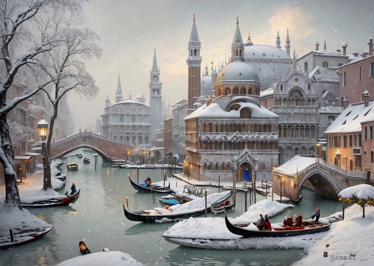 A serene winter scene in Venice, blanketed in snow. Gondolas float on a tranquil canal, surrounded by historic buildings and softly glowing streetlights, evoking a magical, timeless atmosphere.