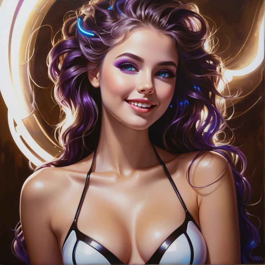 A young woman with long, wavy purple hair and striking blue eyes smiles brightly. She wears a stylish bikini top, set against a glowing backdrop that enhances her vibrant features.