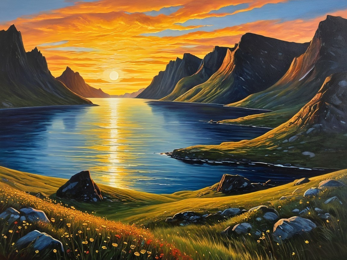 In the Realm of the Midnight Sun is a captivating oil painting that beautifully captures the enchanting glow of twilight. Rich colors and intricate details evoke a sense of wonder and tranquility.
