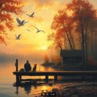 A serene sunset casts golden light over a peaceful lake, where a person sits on a dock with a dog. Vibrant autumn leaves frame a rustic cabin in the background, creating a tranquil atmosphere.