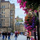 A picturesque village street lined with blossoming trees and colorful flowered pots. Charming buildings feature awnings, and a distant castle tower contrasts with majestic mountains under a vibrant sky.