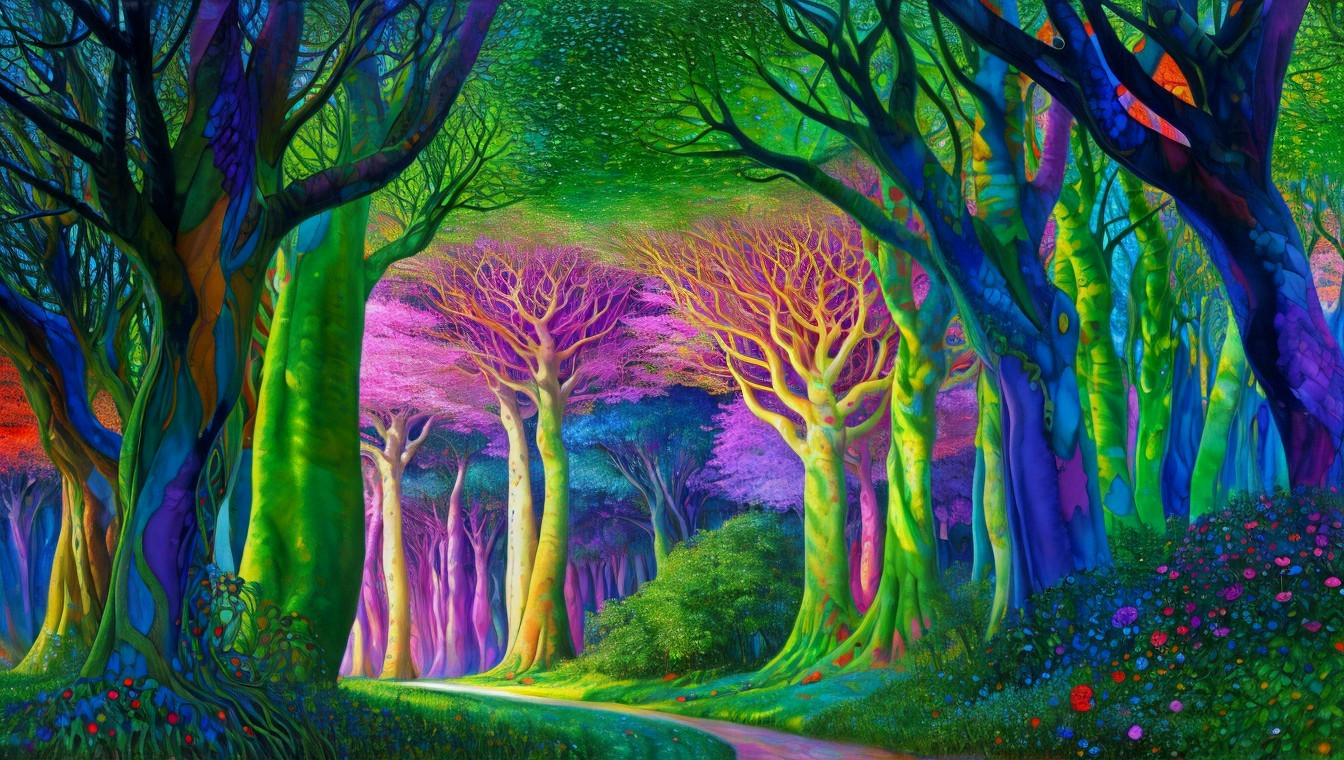 A vibrant, colorful forest with a winding path, multi-colored trees, and a magical atmosphere.