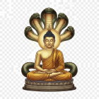 The image features a central golden Buddha statue in a meditative pose, flanked by two green Buddha figures, all set against a soft, ornate background with swirling patterns.