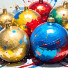 A vibrant arrangement of Christmas ornaments in various colors, including gold, blue, red, and silver, surrounded by colorful paint splatters, creating a festive and cheerful atmosphere.