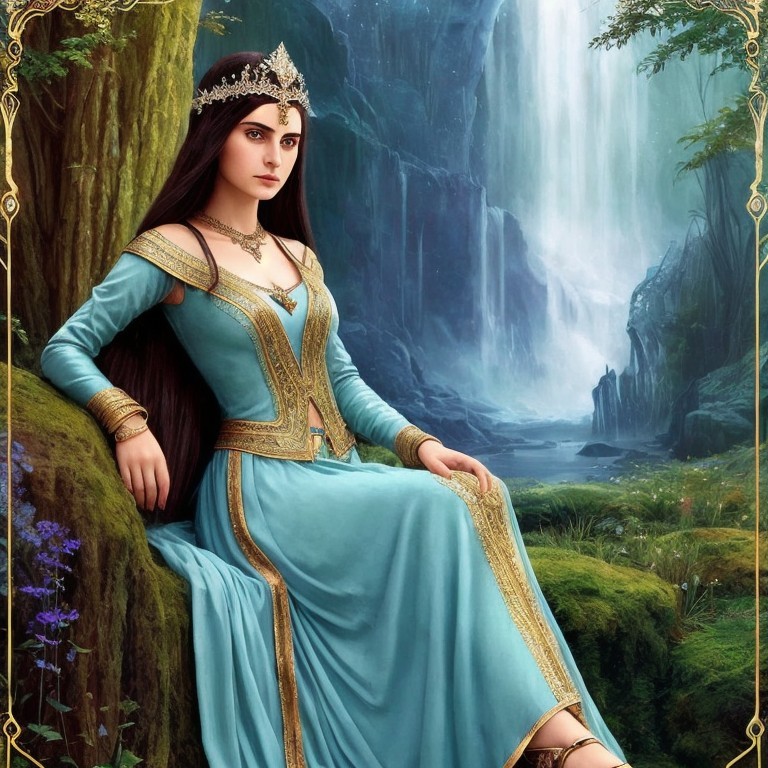 An illustrated queen in a flowing blue gown and a tiara sits regally by a waterfall in a lush, fantasy landscape.
