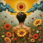 A figure with a floral crown stands amidst vibrant sunflowers and wildflowers, facing a radiant sun. The warm colors and serene atmosphere evoke a sense of peace and connection to nature.