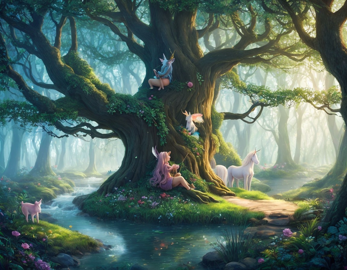 Enchanting forest with a mystical treehouse, lanterns, deer, and a serene stream surrounded by lush greenery and blooming flowers.