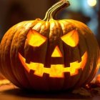 A carved pumpkin with a mischievous grin and glowing eyes sits among autumn leaves, illuminated by a candle nearby, capturing the essence of Halloween festivities.
