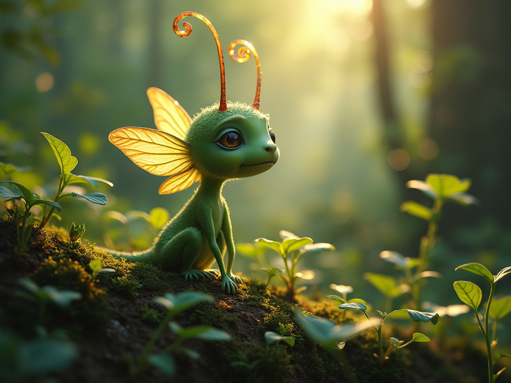A whimsical fairy sits serenely on a mossy stone, adorned with leafy accessories and delicate, glowing wings. Sunlight filters through a lush forest, creating a magical and serene atmosphere.