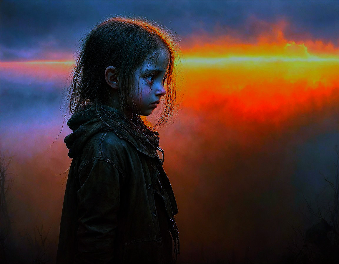 Prompt: "In the midst of the post-apocalyptic setting, a weeping child takes center stage in this haunting painting inspired by Zdzisław Beksiński. The child, their features delicately rendered, embodies an aura of innocence and vulnerability. Tear-stained cheeks glisten with the dim light that filters through the smoky atmosphere, reflecting the depths of their sorrow. Their eyes, filled with a mixture of fear, sadness, and a glimmer of hope, convey a profound emotional weight. The child's hunched form and slumped shoulders encapsulate the weight of their despair, capturing the viewer's attention and evoking an empathetic response. Amidst the desolation, the child becomes a poignant reminder of the human capacity to endure and seek solace even in the bleakest of circumstances."