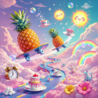 A whimsical scene featuring skateboarding pineapples and cheerful suns amidst dreamy clouds. Colorful teacups, rainbows, and playful cats enhance the vibrant, surreal atmosphere.