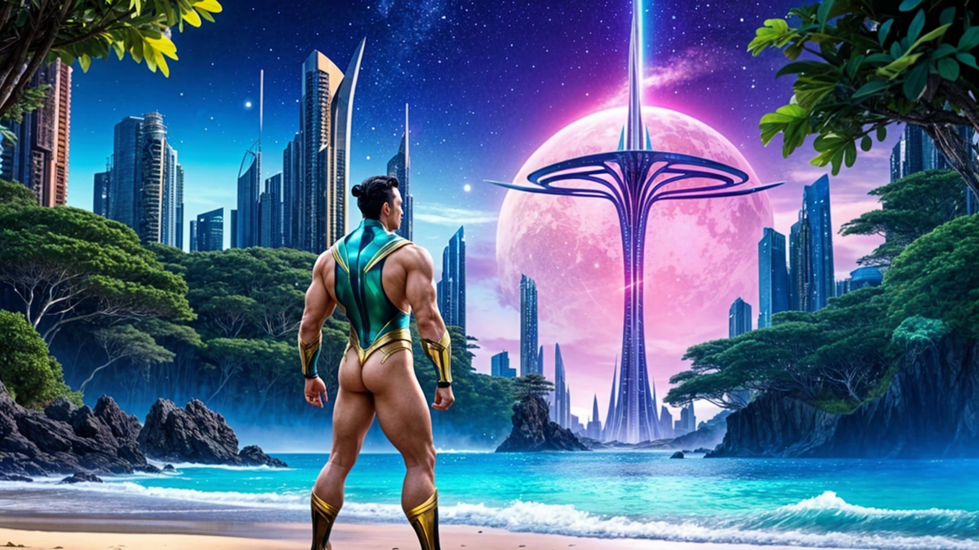 A muscular superhero stands confidently by a tropical beach, wearing a teal and gold costume. Behind him, a large moon and futuristic towers rise over a serene ocean landscape.