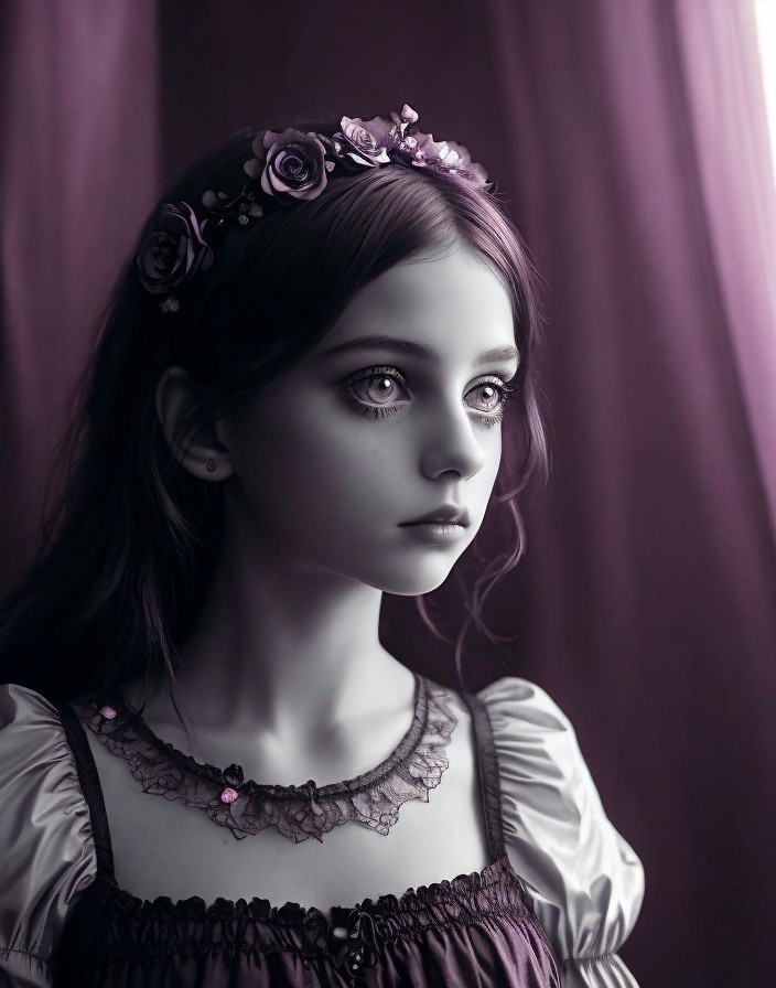 A young woman with long, wavy hair adorned with purple flowers gazes thoughtfully. She wears an elegant, historical costume with intricate details, framed by soft, draping curtains.