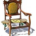 The image features an ornate wooden chair with a decorative backrest and armrests. It has a plush, patterned cushion and a woven seat with fringes, showcasing an elegant vintage design.