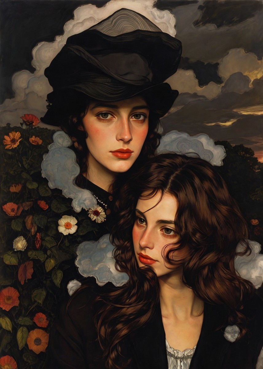 A woman with curly hair and a vintage outfit poses elegantly against a sunset-lit townscape.