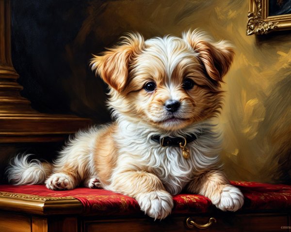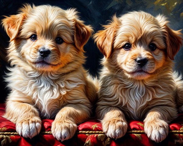 Two adorable puppies stand on a small iceberg in a serene, icy landscape. One pup wears a cozy jacket, while the other playfully barks, with a quaint village visible in the background.
