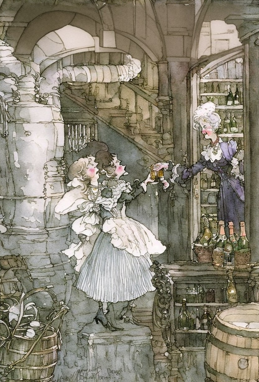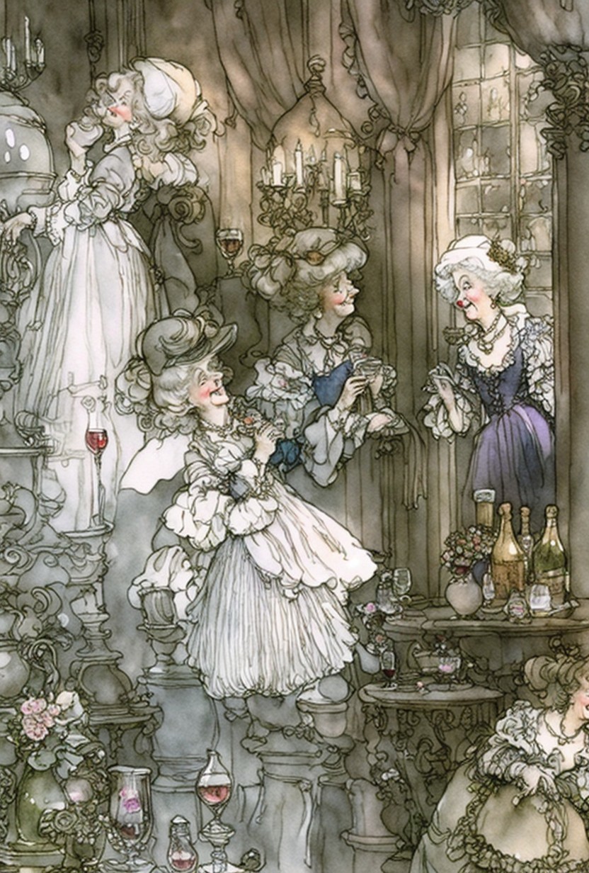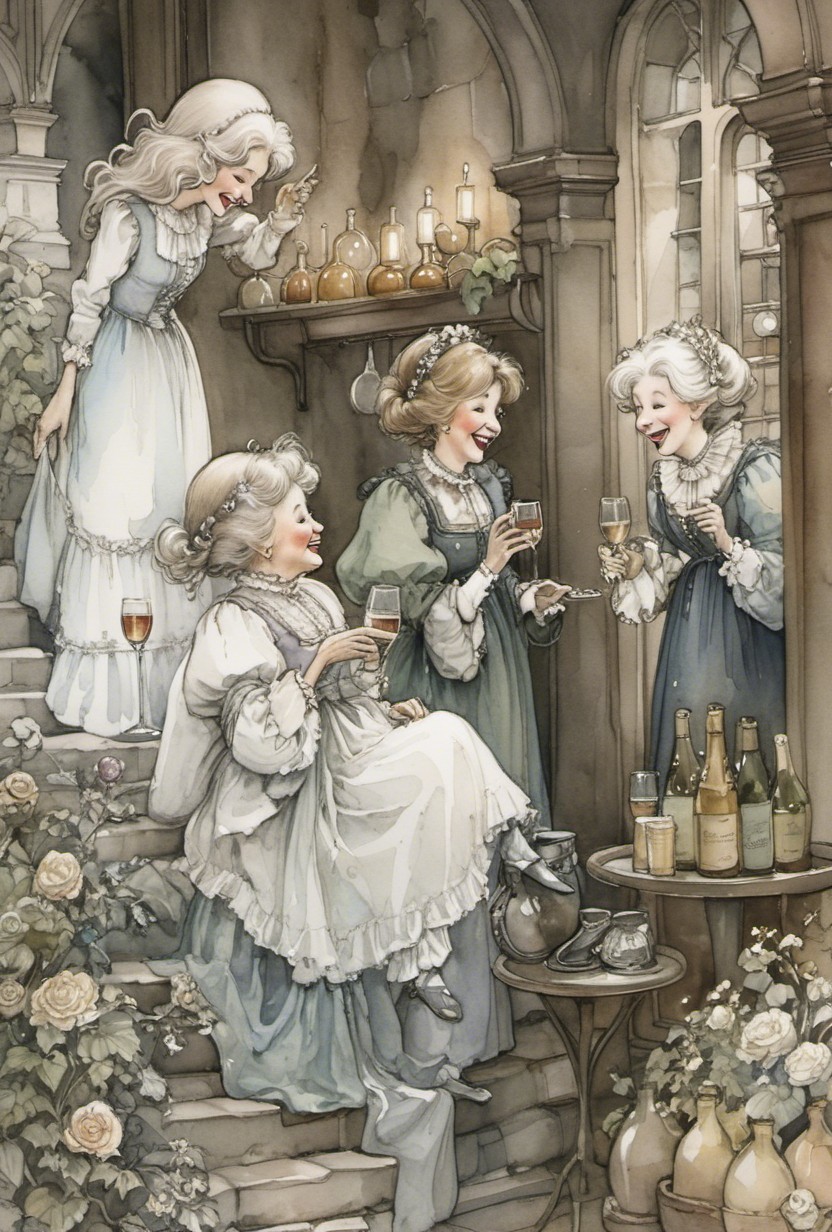 Four elegantly dressed women gather on a staircase, holding glasses. They share laughter and joy amidst a charming setting with shelves of drinks and greenery. A scene of celebration and friendship.