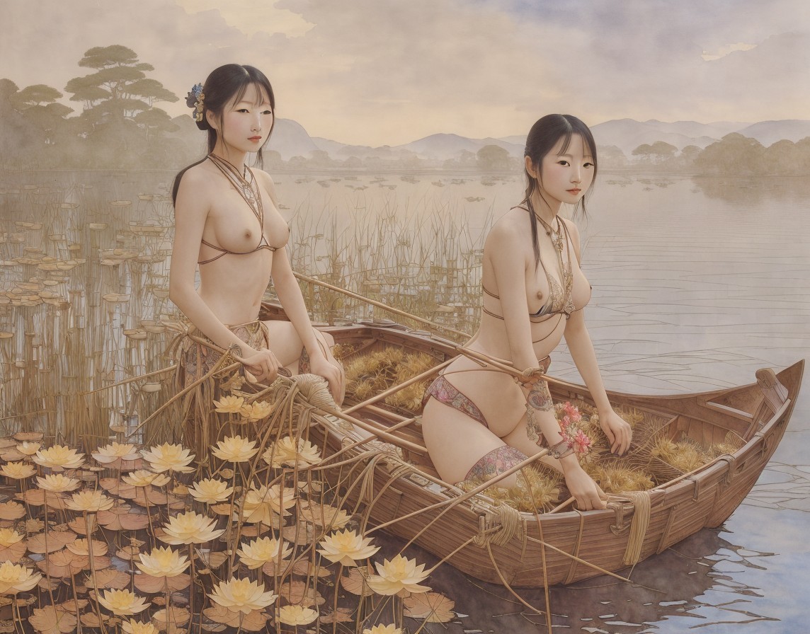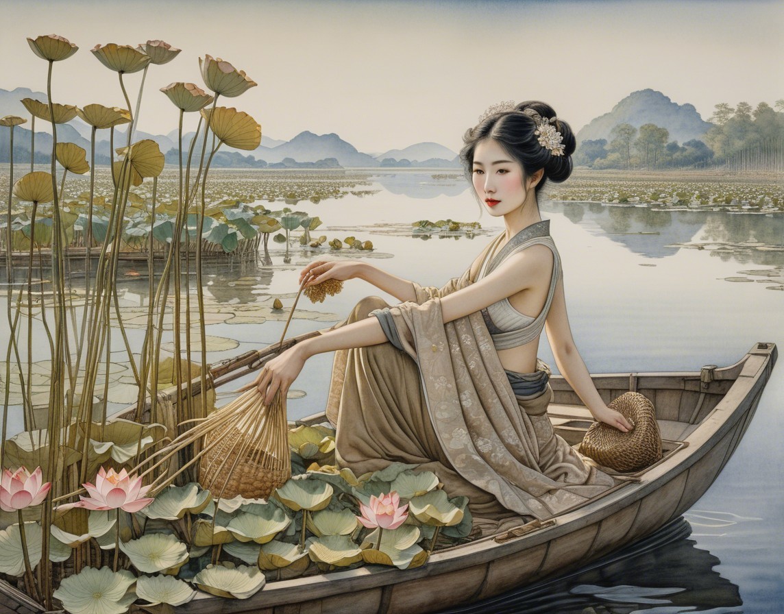 A serene painting of a woman in a boat amidst lotus flowers on a calm lake, reflecting traditional Asian aesthetics.