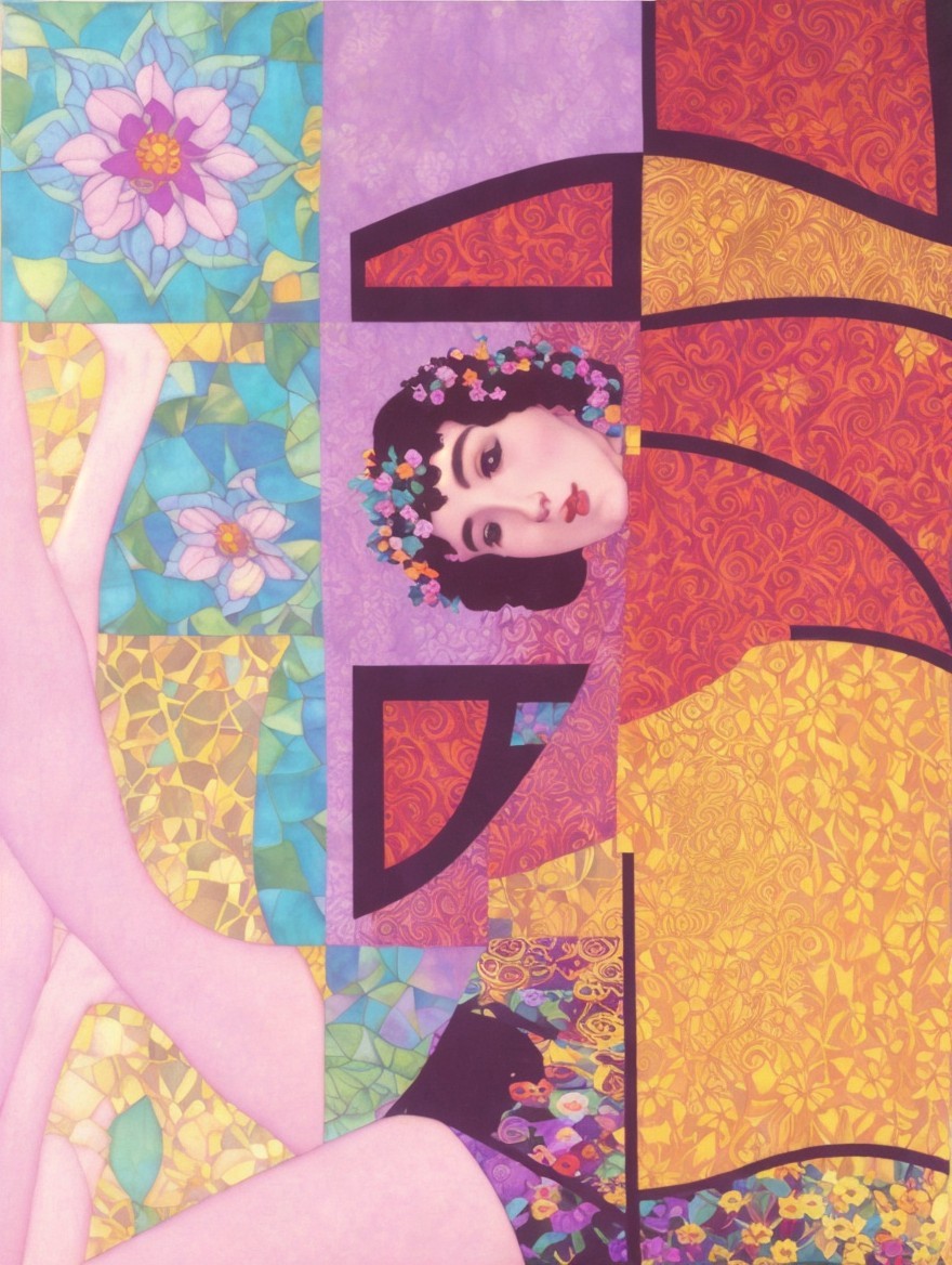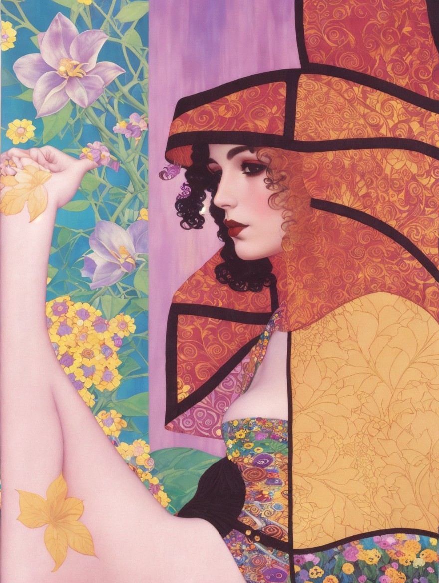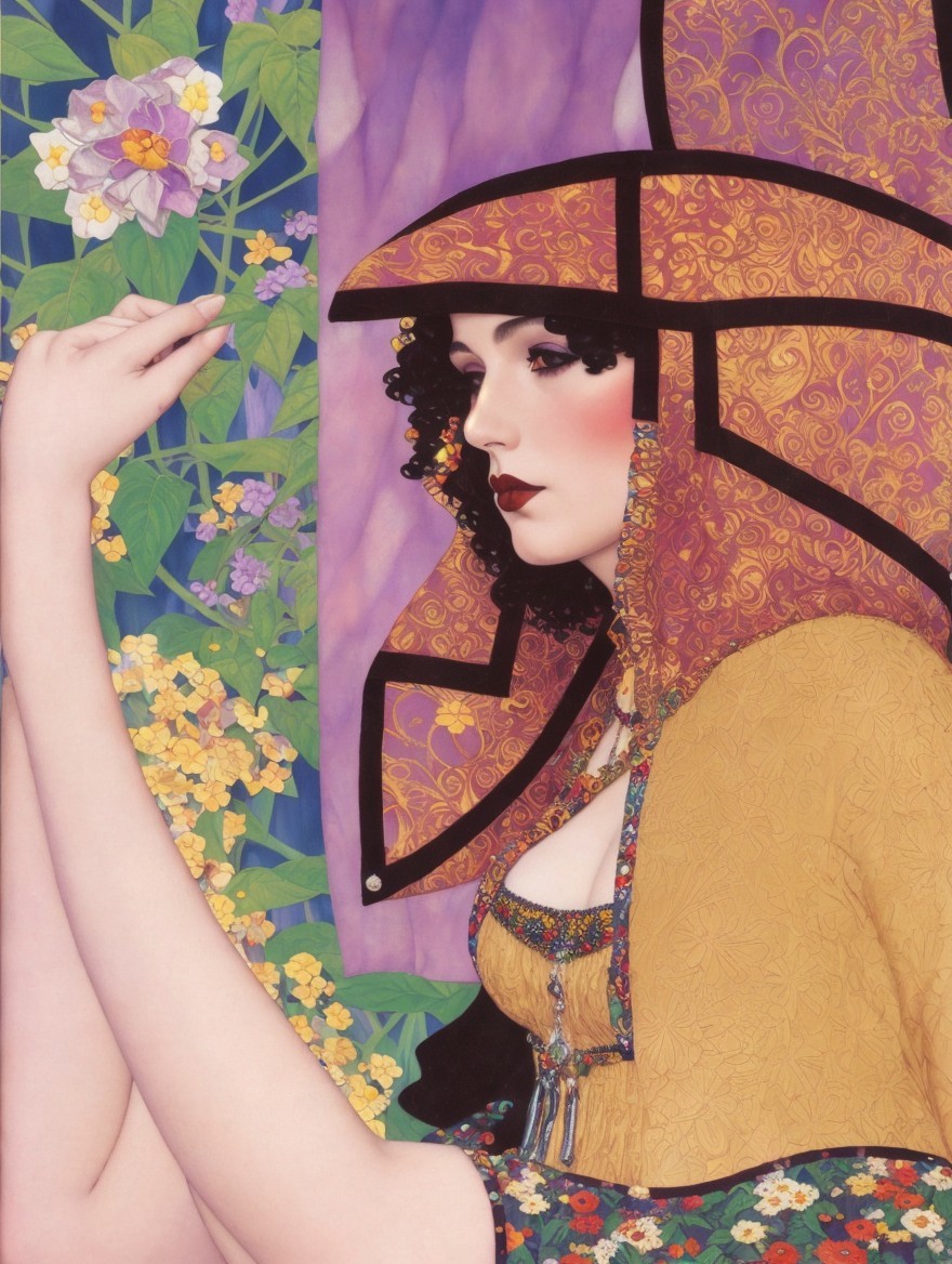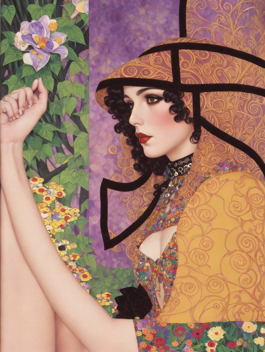 A woman in a vibrant yellow outfit with a hat touches a flower; a detailed floral background complements her elegant look.