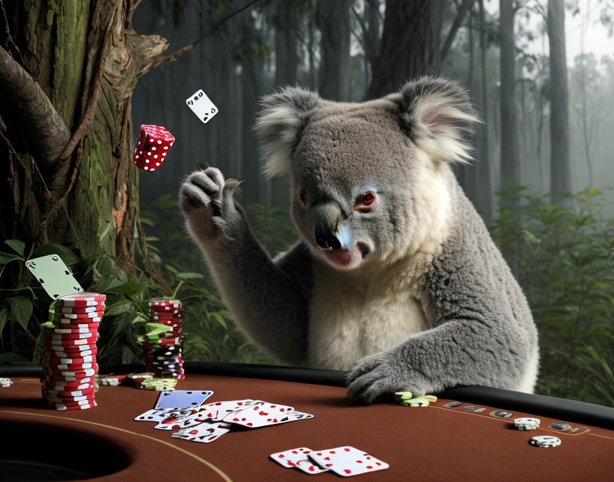 A koala sits at a poker table in a forest setting, throwing cards with a serious expression, surrounded by poker chips.