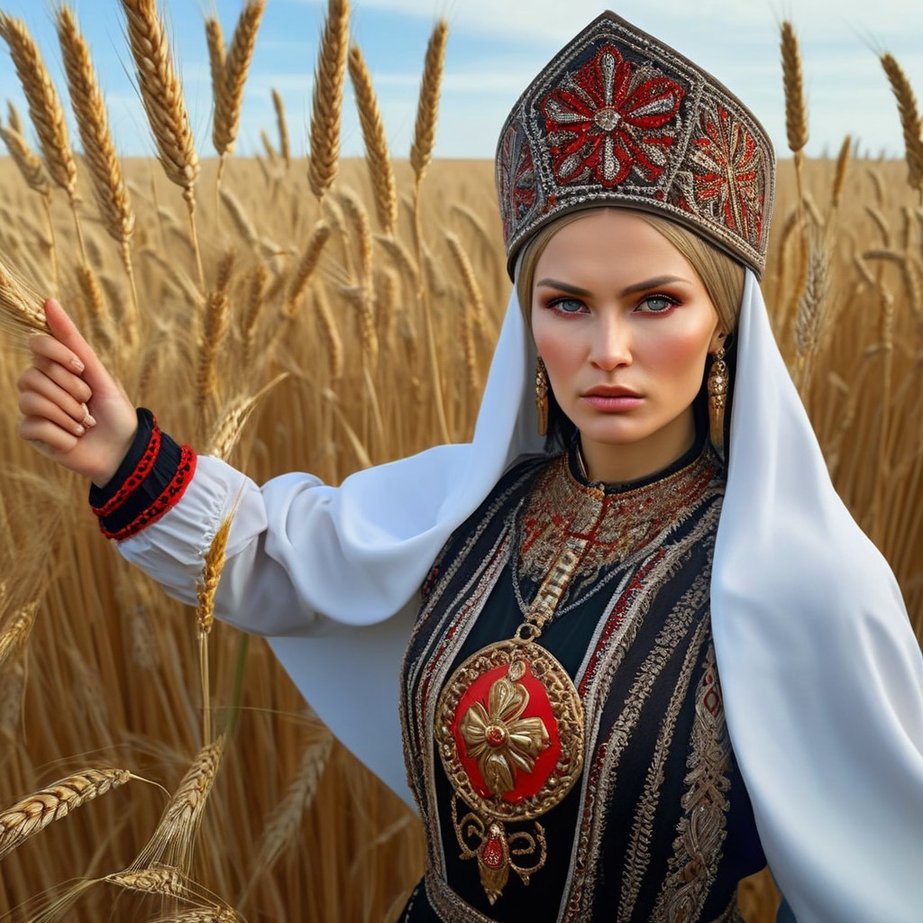A woman in traditional attire with intricate embroidery and a headpiece stands amidst golden wheat.