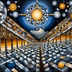 A whimsical Halloween scene features rows of glowing jack-o'-lanterns set against eerie, moonlit houses. The sky is filled with clouds and two bright full moons, enhancing the spooky atmosphere.