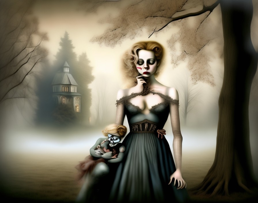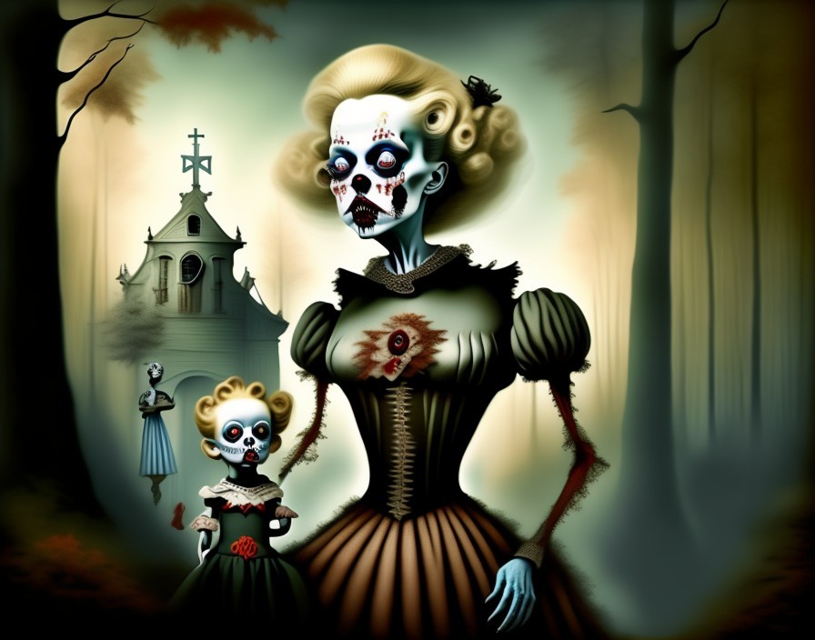Two stylized characters with skull makeup in vintage attire stand before a spooky backdrop with a church and cemetery.